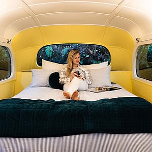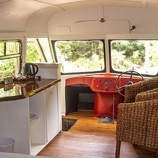 Private riverside converted bus with double bed