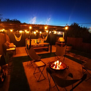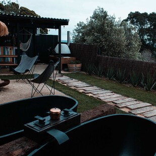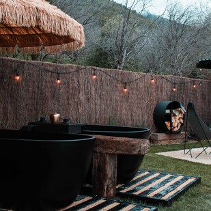 Facilities include standard modern kitchen amenities as well as an outdoor wood fired oven/pizza oven, bbq, fire pit, water sourced from a local spring, outdoor twin baths and a compost toilet in the bathroom beside the tent.